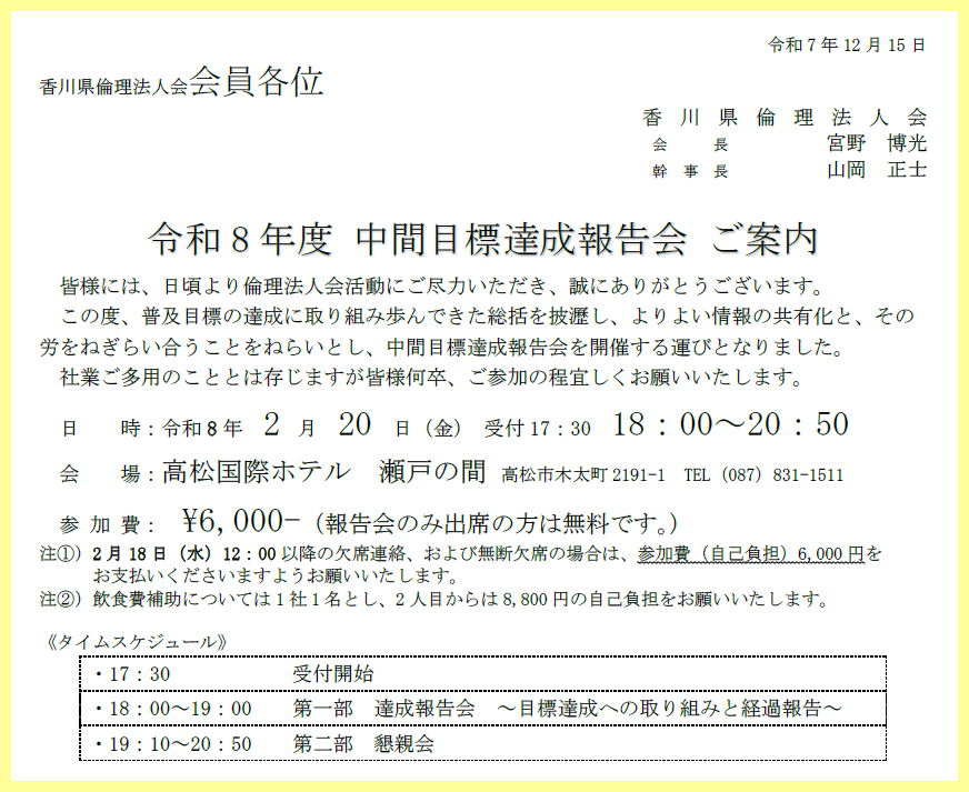 令和8年2月20日(金) 令和8年度中間目標達成報告会 投稿日 2025年12月15日 著者 bit_kuwajima カテゴリー お知らせ カテゴリー 活動報告 日 時 :令和8年2月20日(金) 18:00~19:00 報告会 19:10~20:50 懇親会 場 所 :高松国際ホテル 対 象 者 :全会員 懇親会費:6,000円 2026.2.20 令和8年度中間目標達成報告会 案内のチラシ・申し込み用紙のダウンロードはこちらから